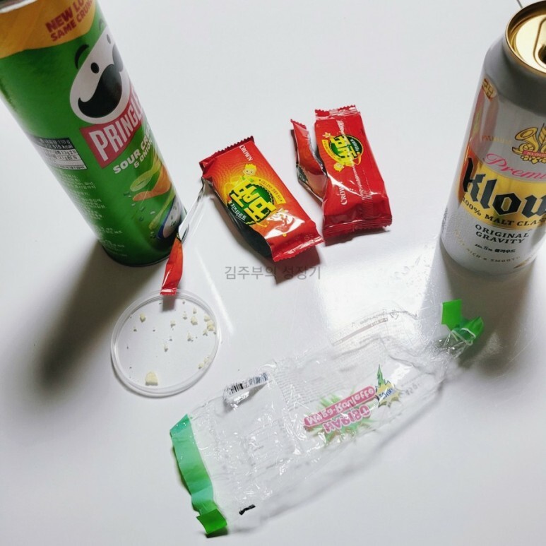 피자 다먹고 맥주 안주 부족해서 까까랑 젤리도 엄청 먹었다..